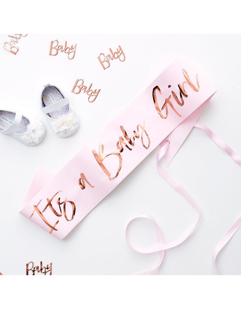 Onze Its a Girl sjerp heeft prachtige roségouden verchroomde letters met de tekst 'It's A Baby Girl' op een roze achtergrond van zacht papier. Een leuke finishing touch voor het maken van bijzondere herinneringen.